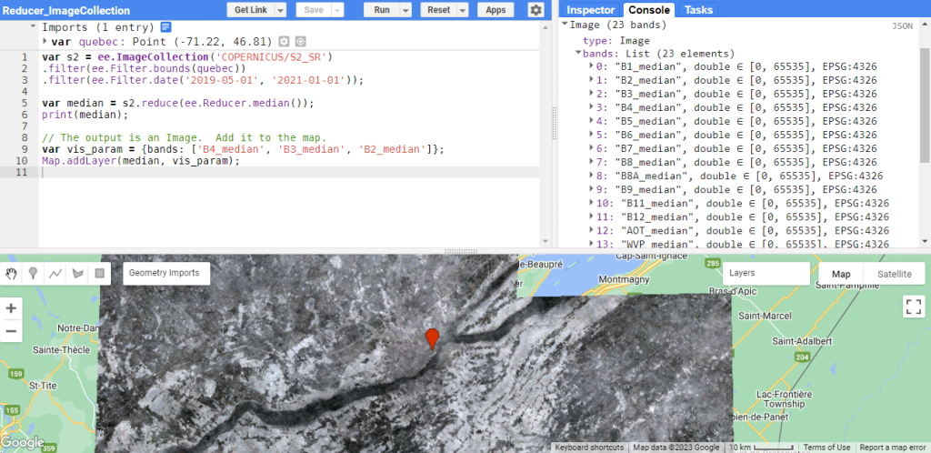 Figure 73 : Application de la fonction reducer sur une collection d’images Sentinel-2 avec pour paramètre la médiane