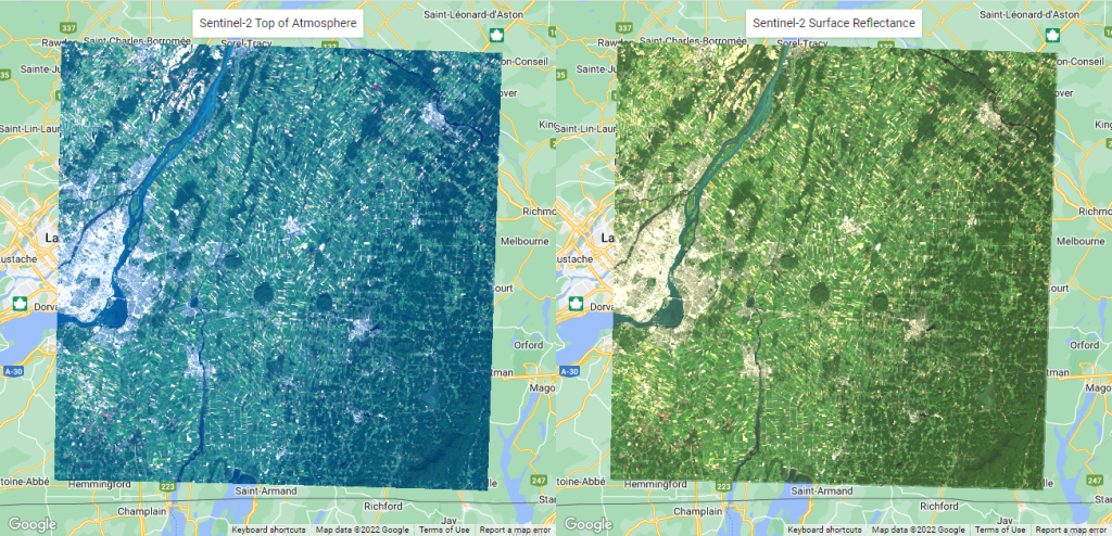 var s2_toa = ee.ImageCollection(‘COPERNICUS/S2’).filter(ee.Filter.bounds(montreal)).filter(ee.Filter.date(‘2019-05-01’, ‘2021-01-01’));