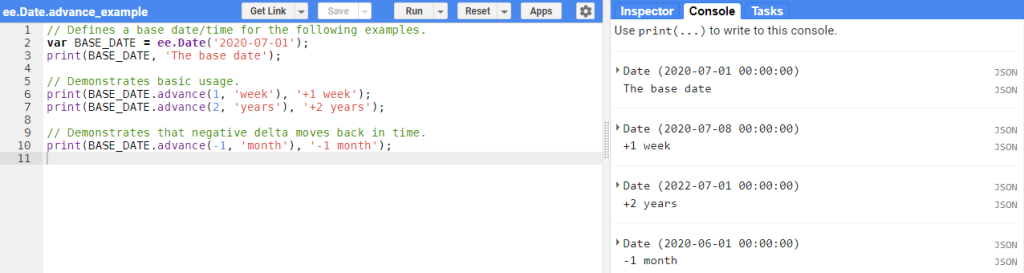 Si vous souhaitez reculer ou avancer dans le temps en fonction d’une date spécifique, vous devez utiliser ee.Date.advance pour cela. Nous vous montrons comment cela fonctionne à travers un exemple (Figure 47) :