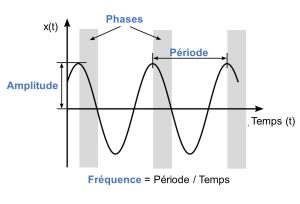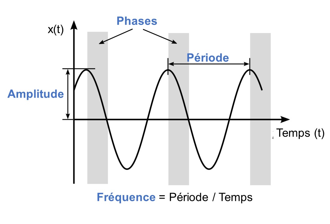 Graphique présentant deux cycles d’oscillation d’une variable en fonction du temps. La période est présentée comme le temps entre le début et la fin d’un cycle. L’amplitude est calculée comme l’écart entre la valeur maximale et la valeur moyenne du cycle. La fréquence est égale à la période divisée par le temps. Des zones grisées à intervalle régulier représentent une phase.