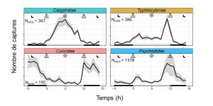 Quatre graphiques du nombre de captures en fonction du temps chez différents taxons d’insectes. Le nombre de captures chez les Calyptratae est très faible la nuit, mais élevé le jour avec un maximum en milieu de journée. Le nombre de captures chez les Culicidae est élevé la nuit, mais faible le jour. Le nombre de captures chez les Typhlocybinae et les Psychodidae reste faible le jour et la nuit, mais présente un léger pic au lever du soleil et un fort pic au coucher du soleil.