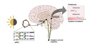 En absence de lumière, les cellules ganglionnaires de la rétine envoient un signal au noyau suprachiasmatique. Le signal est transmis au ganglion cervical supérieur, puis à l’épiphyse. Dans les cellules pinéalocytes de l’épiphyse, la sérotonine est convertie en mélatonine par l’enzyme AANAT. La mélatonine est sécrétée dans le système circulatoire et atteint les autres organes du corps.