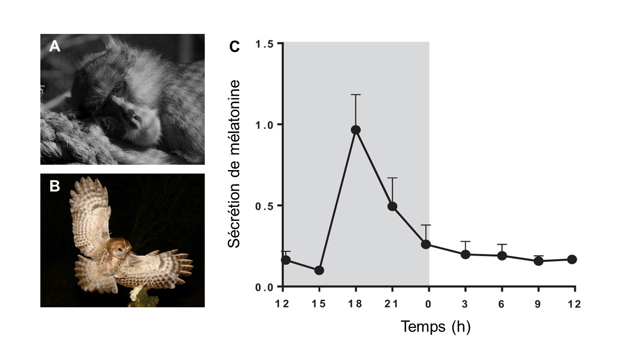 A) Un singe qui dort durant la nuit représentant une espèce diurne et B) une chouette qui vole dans la nuit représentant une espèce nocturne. C) Un graphique de la sécrétion de mélatonine en fonction du temps en heures. La sécrétion de mélatonine augmente au cours de la nuit et redescendant pour atteindre un niveau très bas au courant de la journée chez les deux espèces.