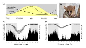 A) Graphique présentant une courbe normale de la photopériode au cours d’une année, atteignant son maximum à l’été. Une courbe représentant la sécrétion de mélatonine en forme de cloche inversée, où son maximum se trouve en hiver et son minimum en été. Une courbe de l’activité locomotrice du microcèbe mignon suit celle de la photopériode, car cet animal diminue son activité en hiver pour entrer en dormance. B) Individu microcèbe mangeant un fruit. C) et D) sont des graphiques de la température corporelle et l’activité locomotrice en fonction de l’heure de la journée chez des individus en milieu naturel (C) et des individus exposés à la pollution lumineuse nocturne (D). Les individus des deux environnements présentent une diminution de la température au cours de la journée lorsqu’ils dorment, mais cette diminution est beaucoup moins prononcée chez les individus exposés à la pollution lumineuse. L’activité locomotrice est aussi plus élevée la nuit que le jour chez les individus des deux environnements, mais l’activité locomotrice nocturne est plus élevée chez les individus en milieu naturel que ceux exposés à la pollution lumineuse.