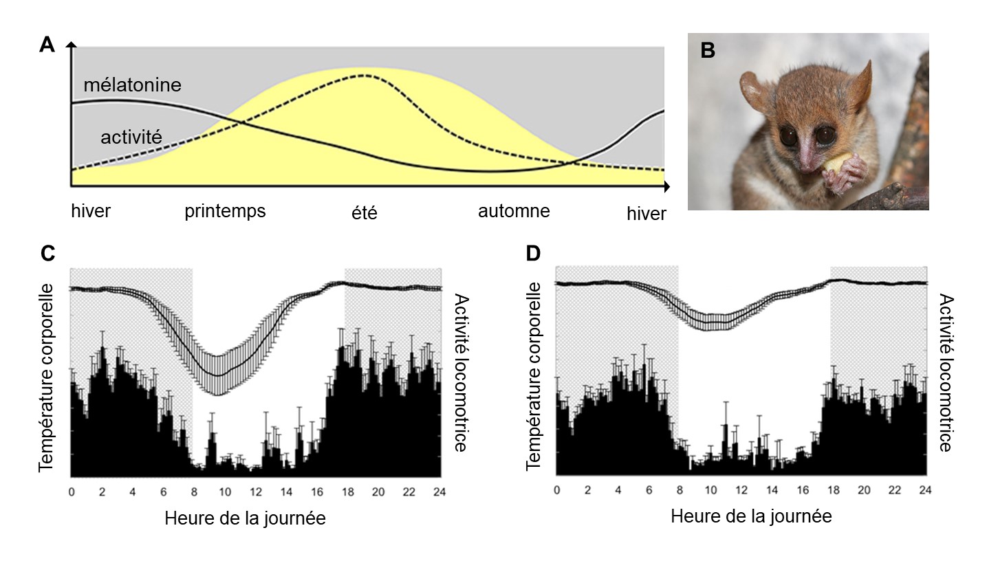 Figure 12.13. Cycles annuels de la sécrétion de mélatonine, de la température corporelle et de l’activité locomotrice d’un lémurien nocturne, le microcèbe mignon (Microcebus murinus), illustrant le photopériodisme. A) Synchronisme entre la photopériode (jaune), la sécrétion de mélatonine et l’activité locomotrice moyenne d’un individu à l’échelle annuelle. La sécrétion quotidienne de mélatonine est plus élevée en hiver alors que la durée de la nuit est plus longue, et elle est plus faible en été lorsque la durée du jour est plus grande. La hausse de sécrétion de mélatonine en automne est un indicateur de l’arrivée de l’hiver, où le microcèbe diminue son activité locomotrice et effectue une forme de dormance. B) M. murinus. C-D) Rythme journalier de la température corporelle (courbe supérieure) et l’activité locomotrice (histogramme) chez ce lémurien nocturne. Les individus en milieu naturel (C) sont comparés à des individus exposés à la pollution lumineuse nocturne (D). L’aire grisée représente la nuit. Durant le jour, alors que les individus dorment, leur température corporelle baisse, ce qui n’est pas le cas lorsqu’ils sont exposés à la pollution lumineuse. Durant la nuit, les individus sont plus actifs, mais cette hausse de l’activité est moindre chez les individus exposés à la pollution lumineuse. Ces changements indiquent que la photopériode peut influencer les individus de cette espèce au niveau physiologique et comportemental et que cela est visible dans un rythme journalier et annuel. Adapté de [18-20].