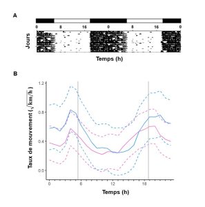 A) Actogramme présentant l’activité locomotrice quotidienne d’une souris. L’axe des y représente la journée et l’axe des x l’heure de la journée. Une marque verticale est visible si la souris utilise la roue pendant cette période. Les bandes noires visibles seulement entre 17h et 7h montrent que la souris est active la nuit et au repos le jour. B) Strip-chart du taux de mouvement de deux ours bruns en fonction de l’heure de la journée. Les deux individus présentés montrent une augmentation de leur taux de mouvement au lever et au coucher du soleil.