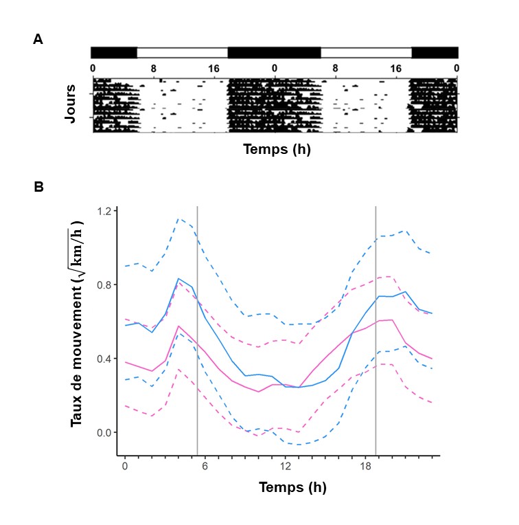 Figure 12.3. Rythme circadien de l’activité locomotrice chez deux mammifères. A) Actogramme de l’activité de la roue dans la cage d’une souris. Le graphique montre si la souris est active ou non selon le jour de l’année (axe y) et l’heure de la journée (axe x). B) Strip-chart du taux de mouvement en fonction de l’heure de la journée chez l’ours brun (Ursus arctos marsicanus). La ligne bleue représente un individu mâle et la ligne rose un individu femelle. Les lignes pointillées représentent les intervalles de confiance à 95 %. Les lignes verticales grises représentent l’heure du lever et du coucher du soleil. Adapté de [3, 4].