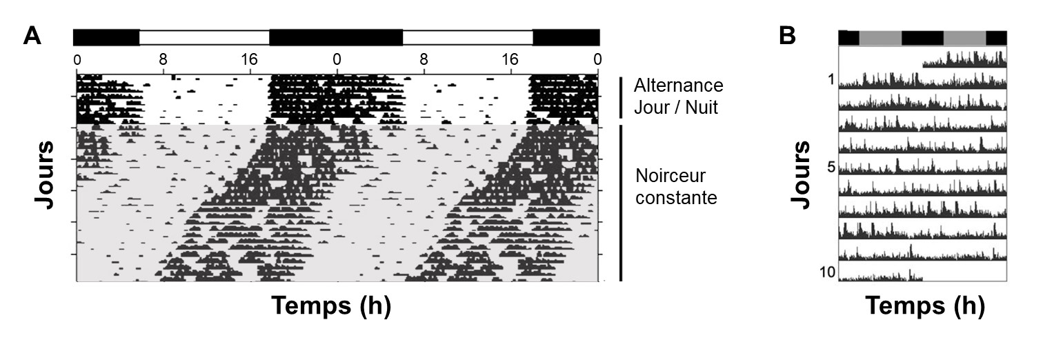 Actogrammes de l’activité locomotrice de deux espèces montrant l’activité ou non d’un individu selon le jour (axe y) et l’heure de la journée (axe x). A) Un rythme circadien est observé lorsque la souris se trouve dans un milieu où il y a alternance de luminosité et de noirceur (jour-nuit). Un rythme est toujours conservé lorsque l’individu est placé dans un milieu en absence de luminosité. Il s’agit de la période en libre cours. Celle-ci présente une période légèrement différente de 24 heures, ce qui crée un décalage de plus en plus grand avec le rythme initial jour-nuit. B) En absence de lumière, l’épinoche à trois épines montre une absence de période en libre cours, de grandes variations de son activité sont observées, mais aucun rythme n’est visible.