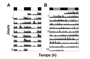 A) Actogramme du rythme circadien de l’activité locomotrice chez l’épinoche à trois épines en environnement avec alternance jour-nuit. L’individu est très actif la nuit et peu le jour. B) Actogramme de l’activité locomotrice d’un individu placé en absence de lumière. Il n’y a pas de rythme circadien.