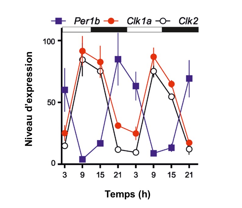Figure 12.9. Niveau d’expression d’ARN messager d’éléments positifs et négatifs de l’horloge biologique chez le poisson-zèbre (Danio rerio). L’élément négatif period (per1b) est représenté en bleu et les éléments positifs clock (clk1a et clk2) sont rouge et blanc. Adapté de [10].