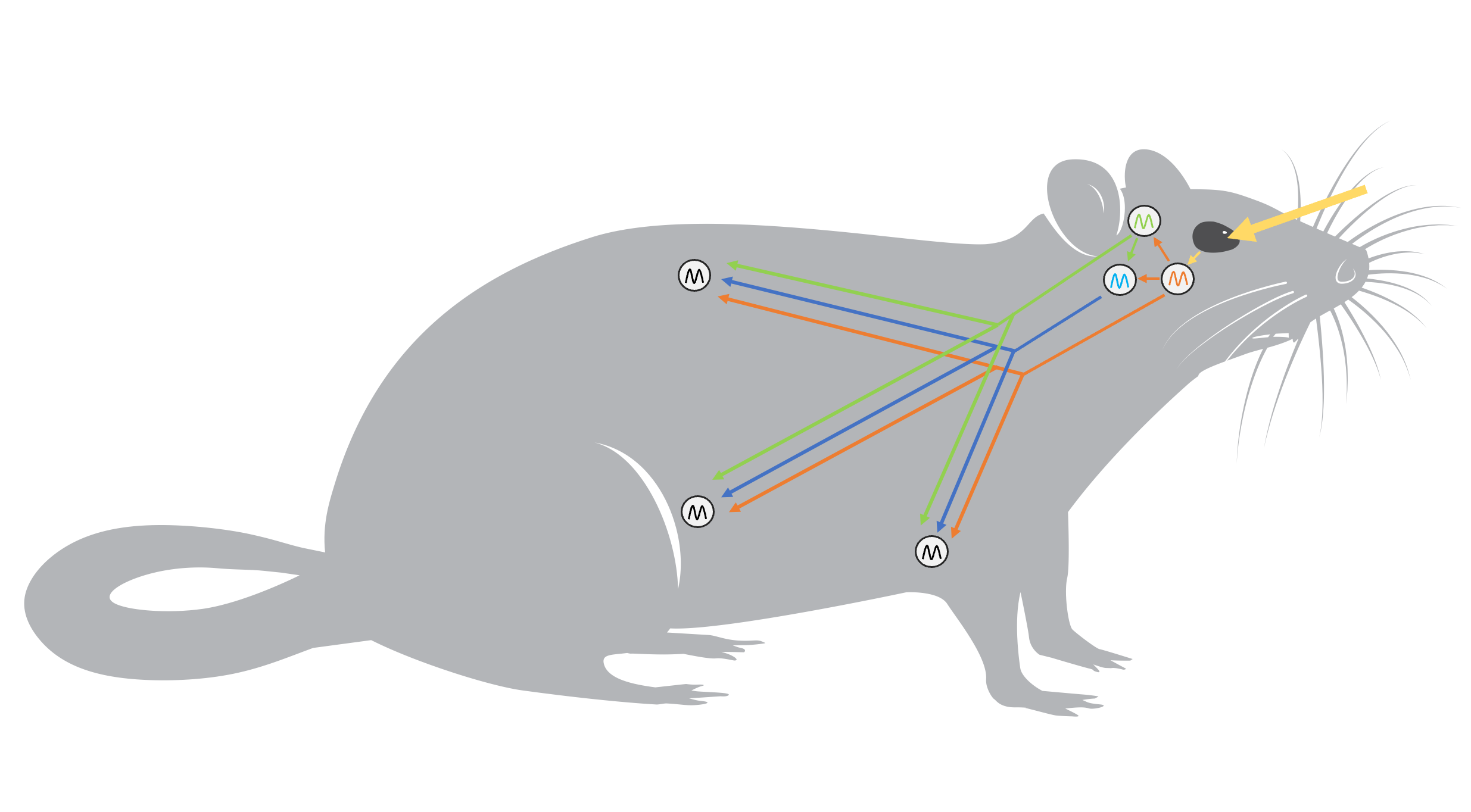 Figure 12.7. Connexion entre les différentes composantes des rythmes biologiques chez un mammifère. La lumière agit comme zeitgeber et est perçue au niveau des yeux (flèche jaune). Le signal lumineux est transformé en signal nerveux qui atteint l’horloge biologique maitresse dans le noyau suprachiasmatique de l’hypothalamus (en orange). Cette horloge biologique maitresse affecte (flèches orange) le rythme des horloges périphériques du reste du cerveau (en bleu) et des autres tissus (en noir). Les horloges biologiques périphériques du cerveau affectent aussi les rythmes des horloges biologiques périphériques des autres tissus (flèches bleues). L’horloge biologique maitresse du NSC envoie l’information sur le signal lumineux à l’épiphyse, une glande endocrine (en vert). L’épiphyse sécrète de la mélatonine, un signal hormonal (flèches vertes) qui affecte les horloges biologiques périphériques. Adapté de [8].