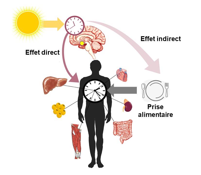 Un corps humain où une horloge est présente dans le cerveau est illustré, ainsi que ses effets directs et indirects sur les différents organes et tissus tels que le foie, le tissu adipeux, les muscles de la jambe, l’intestin, le rein et le cœur. La lumière du soleil a un effet sur l’horloge biologique du cerveau alors que la prise alimentaire a un effet sur l’horloge biologique des autres organes et tissus. Un effet direct et indirect de l’horloge du cerveau agit sur les horloges périphériques. L’effet indirect passe par l’impact sur la prise alimentaire.