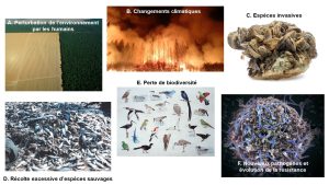 Les grandes questions du 21e siècle sont bien souvent en lien avec la biologie. Plusieurs changements environnementaux rapides induits par les humains nous causent des problèmes (figure 2.1). Que ce soient les enjeux de perturbation de l’environnement par les humains (fragmentation et perte d’habitat, pollution, monocultures), les effets des changements climatiques, la récolte excessive d’espèces sauvages ou la présence d’espèces invasives, on voit la trace des humains dans plusieurs problèmes mondiaux. La perte de biodiversité, l’émergence de nouveaux pathogènes, ainsi que l’évolution de la résistance aux traitements élaborés par les humains pour se débarrasser de ces pathogènes et de différentes pestes, sont aussi des problèmes criants qui nécessiteront l’apport des biologistes pour trouver des solutions.