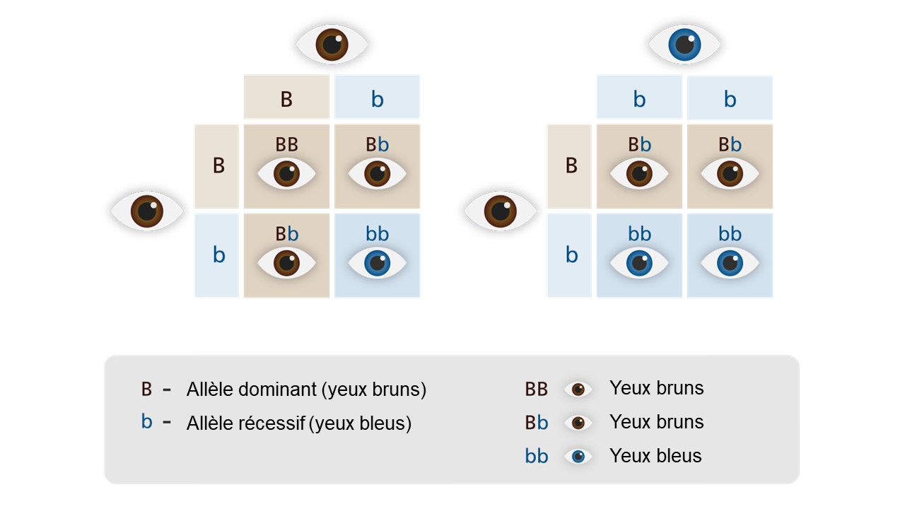 Pour préciser que la présence d’un allèle entraine un phénotype particulier, peu importe l’autre allèle qui compose le génotype diploïde, on parle d’un allèle dominant. L’allèle qui affecte le phénotype seulement s’il est présent en deux copies (un génotype homozygote composé uniquement de cet allèle) est dit récessif. Par exemple, si on imagine un locus qui affecte la couleur des yeux, avoir un génotype qui inclut l’allèle dominant « B » en une ou deux copies (Bb ou BB) donnera des yeux bruns et on ne voit des yeux bleus que lorsque l’allèle récessif « b » est présent en deux copies, résultant en un génotype homozygote bb (figure 2.9). Dans l’exemple de gauche sur la figure, deux individus aux yeux bruns peuvent être tous les deux hétérozygotes (Bb) et avoir une certaine probabilité d’avoir un rejeton qui sera homozygote pour l’allèle récessif bb, résultant en des yeux bleus.