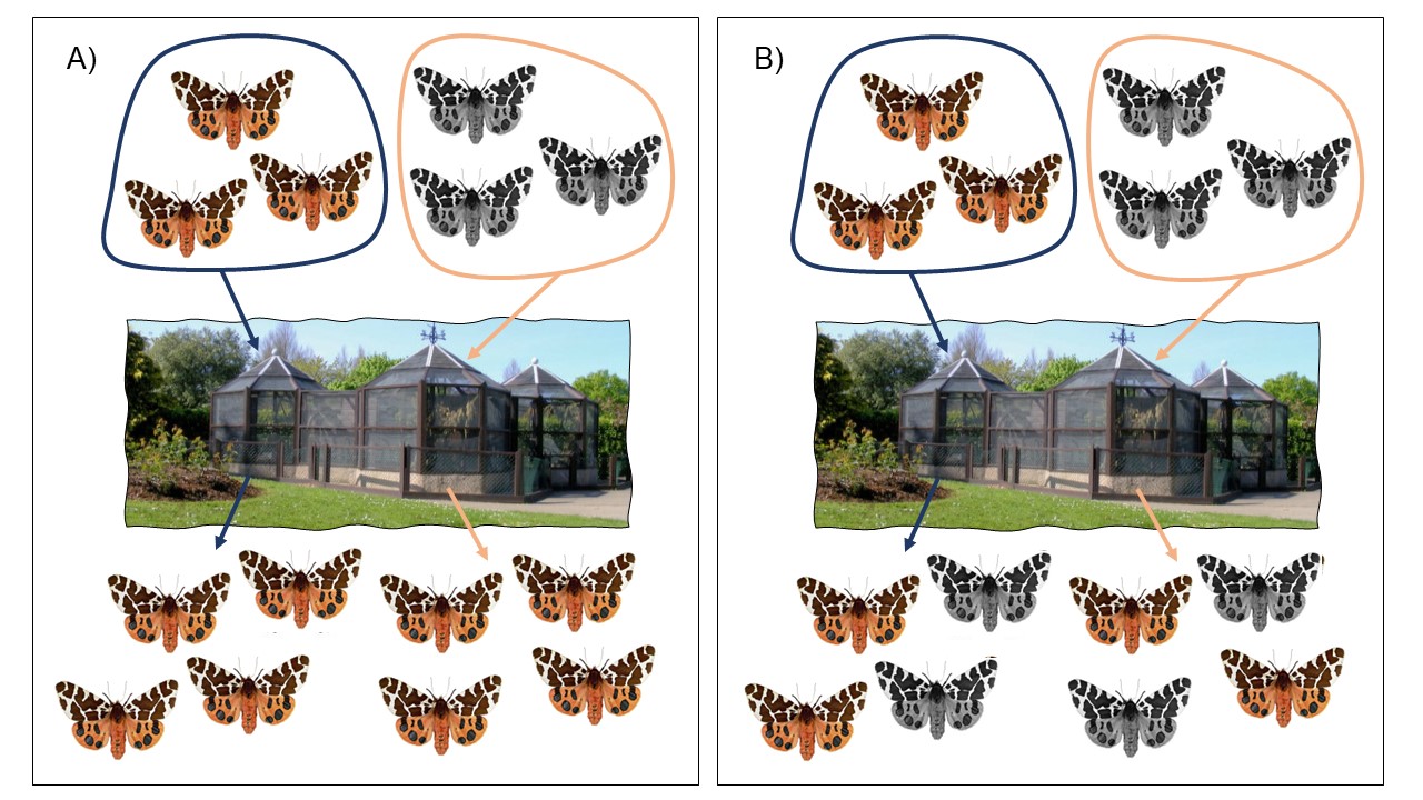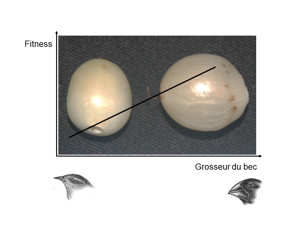 La variation phénotypique nous intéresse particulièrement parce qu’elle peut être associée à des différences de performance et de fitness. Prenons l’exemple de l’expérience classique des pinsons de Darwin : si on réunit dans une volière différentes espèces de pinsons de Darwin qui ont différentes formes et tailles de bec et qu’on les nourrit avec une sorte spécifique de nourriture (disons qu’ils ont tous une noisette comme source de nourriture), on pourra étudier leur capacité à se nourrir de ce type d’aliment. On peut ensuite répéter l’expérience avec différents aliments : fruits à coques, graines délicates, insectes. Il y aura une conséquence à la variation phénotypique: certains individus auront une meilleure performance d’alimentation que d’autres pour une certaine source de nourriture, mais pas pour une autre, selon leur morphologie qui affecte la force et la dextérité de leur bec, et ceci affectera leur survie si on continue l’expérience (figure 2.14). Dans ce cas-ci, on connait d’avance le résultat de l’expérience, mais dans bien des cas, le lien (ou l’absence de lien) entre les différences interindividuelles de phénotypes et les différences de fitness n’a pas été quantifié et on doit donc le vérifier.