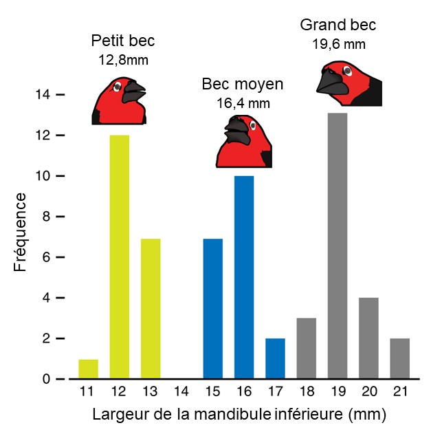 L’étude de la morphologie de ces oiseaux nous donne un excellent exemple de distribution de fréquence de la valeur d’un phénotype (figure 2.16).