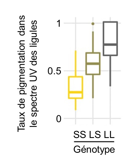 Les biologistes ont découvert un lien entre le génotype à un nucléotide en amont du gène HaMYB111 et la proportion de ligules pigmentés (figure 2.18). Des études antérieures chez d’autres espèces de plantes ont permis de découvrir que ce gène code pour un facteur de transcription qui contrôle l’expression d’autres gènes qui sont impliqués dans la production de molécules anti-oxydantes. Ces molécules ont aussi la propriété d’absorber les UV. Les biologistes ont déterminé qu’une mutation à un seul nucléotide à cette position dans le génome résulte en une différence de phénotype chez la plante. Les individus homozygotes pour l’allèle « S » ont une faible proportion de ligules pigmentées alors que les homozygotes pour l’allèle « L » ont de la pigmentation sur la plupart de leurs ligules (figure 2.18). Les hétérozygotes « SL » ont un phénotype intermédiaire. Grâce à des expériences de jardin commun, les biologistes ont démontré que ces différences de pigmentation sont maintenues que la plante soit élevée en milieu naturel ou en milieu contrôlé, suggérant qu’elles sont dues à de la variation génétique et excluant une influence de l’environnement.