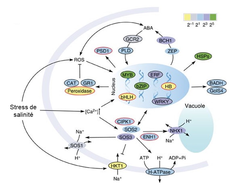 Ces gènes qui sont représentés en de nombreuses copies et qui sont impliqués dans la réponse au stress de salinité sont très exprimés lorsqu’on expose expérimentalement la plante à un stress de salinité (figure 2.21). Ils sont impliqués dans divers processus et se retrouvent dans le noyau, le cytosol et la membrane cellulaire.