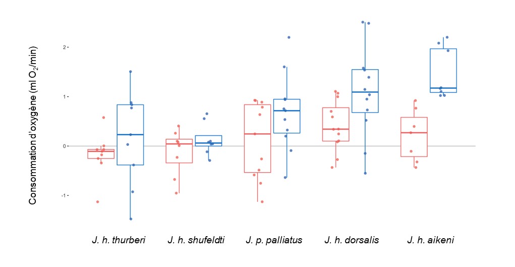 Des biologistes ont utilisé une expérience de jardin commun avec des sous-espèces d’oiseaux du genre Junco (figure 2.22) afin d’étudier les causes génétiques et environnementales de la variation de la capacité d’acclimatation au froid basée sur la capacité thermogénique, c.a.d. la capacité de produire de la chaleur.