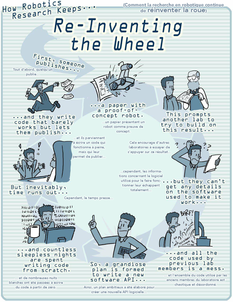 Au fil du temps, le ROS (rebaptisé ainsi par Willow Garage en référence à la pile logicielle inspirée par Berger-Wyrobek-Koenig) et les activités de relations publiques sont devenus la principale préoccupation de Willow Garage, impliquant des investissements de plusieurs millions de dollars. Ces ressources considérables ont clairement contribué à la croissance rapide de ROS, notamment en soutenant financièrement une formidable équipe d’ingénieurs. Cependant, il y avait déjà une poignée de projets source ouverte pour la robotique à l’époque, y compris Player/Stage (Gerkey et al, 2003), la boîte à outils de navigation Carnegie Mellon (CARMEN) (Montemerlo et al, 2003), Microsoft Robotics Studio (Jackson, 2007), OROCOS (Bruyninckx, 2001), YARP (Metta et al, 2006), et plus récemment le Lightweight Communications and Marshalling (LCM) (Huang et al, 2010), ainsi que d’autres systèmes (Kramer and Scheutz, 2007). Ces systèmes offrent des interfaces communes permettant le partage et la réutilisation de code, mais ils n’ont pas connu le même niveau de succès durable que ROS. L’argent seul ne pouvait pas garantir le succès de ROS; il avait besoin d’une communauté solide pour prospérer.