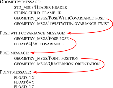 Qu’elle soit décentralisée (ROS2) ou centralisée (ROS1), la communication entre noeuds est structurée en messages [11]. La Figure 5-4 montre le Odometry