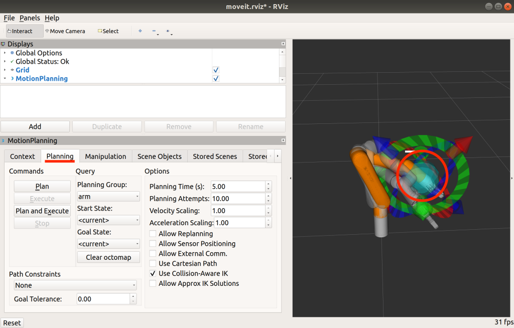 La Figure 5-8 montre MoveIt! en action via RViz à l’aide de marqueurs interactifs. Ces marqueurs peuvent être facilement déplacés vers l’objectif désiré, tandis que le menu de gauche permet à l’utilisateur d’accéder à différents planificateurs et de configurer leurs paramètres. MoveIt! peut également envisager des objets statiques dans la scène pour planifier une solution incluant l’évitement des collisions. Ces objets peuvent être ajoutés manuellement ou importés depuis le simulateur Gazebo.