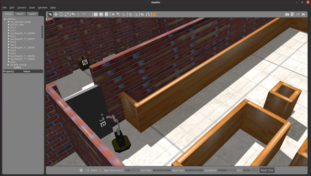 Figure 5-9 : Vue du simulateur Gazebo avec le manipulateur mobile de la mission du Chapitre 18 du projet