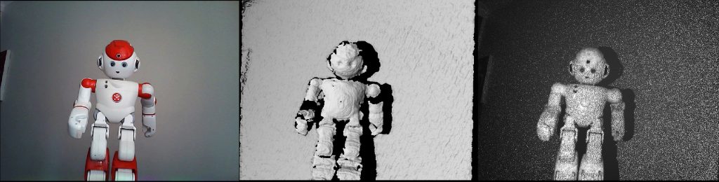 Figure 7-7 : Une vue d’une caméra RVB-D (de gauche à droite – image RVB, image de profondeur, image IR montrant le motif projeté).