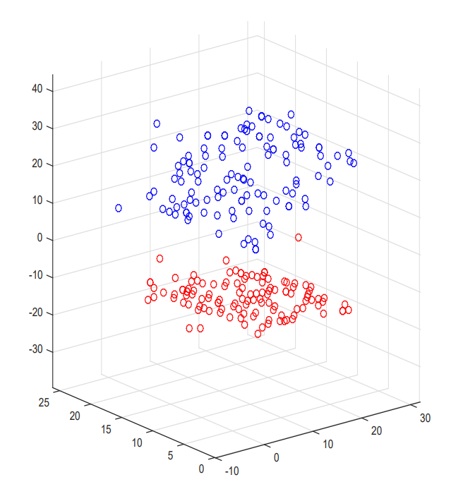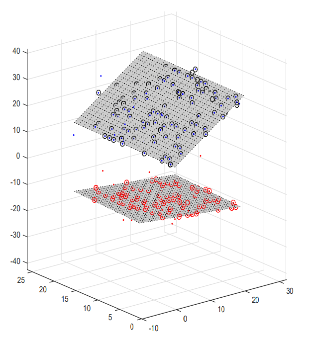En tant que l’une des méthodes les plus connues pour la détection de plan, RANSAC s’est avéré capable de détecter des plans en 2D et en 3D. Par exemple, dans la Figure 7-13, deux groupes de points 3D bruyants (bleu et rouge) avec deux plans détectés avec succès par la méthode RANSAC.