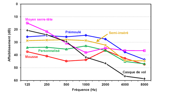 Les performances des bouchons d’oreille conventionnels, des serre-têtes antibruit et d’un casque de vol militaire sont illustrées à la figure 29 . La meilleure atténuation, associée à un bon confort, est généralement obtenue par un bouchon en mousse entièrement ajusté, bien que son atténuation varie sensiblement en fonction de la profondeur d’insertion dans la gamme de fréquence de 125 à 1000 Hz (Berger, 2013). Les bouchons d’oreilles moulés sur mesure peuvent également fournir une atténuation et un confort élevés, mais l’habileté du preneur d’empreinte et la bonne profondeur du moule sont essentielles (Tufts et al., 2013). Les bouchons d’oreille à brides et prémoulés peuvent aussi bien fonctionner, mais ne fournissent habituellement pas autant d’atténuation ni de confort. Cependant, la performance et la tolérance varient considérablement selon les individus,individus d’où la nécessité de choisir parmi une variété de produits.