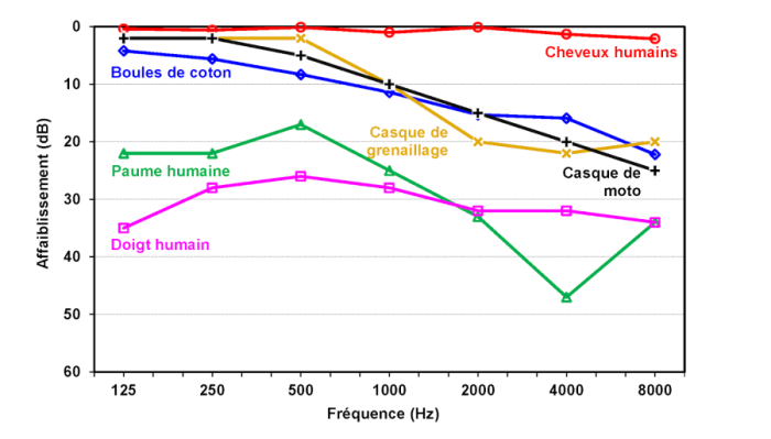 Les casques, lorsqu’ils sont bien scellés autour de la tête et contiennent des Coquilles circumaurales internes, peuvent fonctionner aussi bien que les casques conventionnels à 1000 Hz environ et offrent des niveaux d’atténuation beaucoup plus élevés aux fréquences les plus élevées puisqu’ils protègent le crâne de tels sons(voir la figure 29). Cela permet à l’atténuation de dépasser les limites de conduction osseuse de la tête découverte (figure 26). Cependant, les casques qui ne scellent pas bien, comme les casques de moto et les casques de grenaillage typiques, offrent moins de 10 dB de protection en dessous de 1000 Hz et seulement de 20-25 dB, parfois légèrement plus, aux fréquences plus élevées. La figure 30 montre également des « PIBs » non conventionnels. Les longs cheveux ou poils recouvrant les oreilles n’offrent pratiquement aucune protection. Les boules de coton ou les ouates, souvent utilisées en dernier recours par les personnes qui se trouvent soudainement plongés dans un milieu bruyant et ne protègent que modestement. En revanche, la paume de la main, voire encore plus les doigts, peuvent faire un travail honorable, mais seulement pour des courtes périodes de temps en raison de la perte de capacité fonctionnelle qui en résulte.