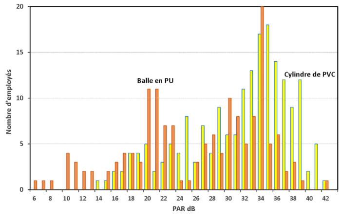 Outre les études terrain examinées ci-dessus, de nombreux utilisateurs de systèmes de test d’adéquation sur le terrain et de publications issues de ces données émergent. Bien que ces études ne soient, généralement, pas aussi bien contrôlées et documentées que les études de recherche sur le terrain, on peut en tirer beaucoup d’enseignements. Les données de la figure 32 proviennent d’un rapport d’une telle étude pour 196 employés qui ont été testés F-MIRE avec un bouchon d’oreille cylindrique en mousse de PVC ( E•A•R Classic™) et 155 employés utilisant un bouchon d’oreille en mousse PU conique (3M™ E•A•Rsoft ™ Yellow Neons ™) (Berger et al., 2008). Les données, exprimées en termes de PAR, proviennent de sept études faites dans cinq usines différentes, incluant des installations de recherche militaire ou de fabrication de produits pétrochimiques. Les employés ont été invités à ajuster les bouchons d’oreille comme ils le feraient normalement pour un usage quotidien et ont été soumis à des tests d’ajustement pour chaque oreille.