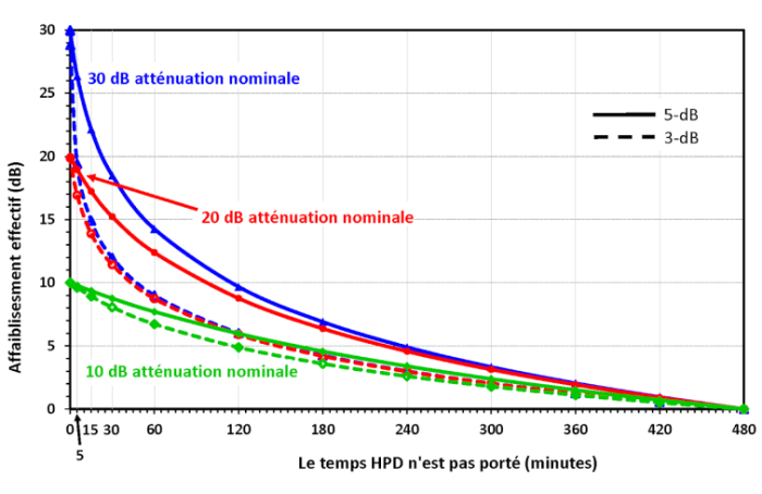 L’atténuation du monde réel rapportée dans le chapitre précédent suppose que le dispositif soit effectivement porté. La protection efficace d’un appareil est considérablement réduite lorsqu’il est retiré, même pour de courts instants, comme illustré à la figure 33 par l’utilisation de valeurs d’atténuation de 10, 20 et 30 dB, et de facteur d’échange (aussi appelé Taux d’échange ou facteur bissecteur) de 3 et 5 dB. Notez que la perte d’atténuation pour de courtes périodes d’inutilisation est beaucoup plus rapide pour les PIBs à atténuation élevée avec un facteur d’échange de 3 dB qu’avec le taux d’échange de 5 dB. Un PIB avec une atténuation nominale de 30 dB qui est retiré pendant 15 minutes pendant une journée de travail de 8 heures fournit une atténuation effective de seulement 22 dB et donc une perte de 8 dB. Avec un facteur d’échange de 3 dB, la perte de son atténuation effective est encore plus importante et atteint 15 dB. Des réductions plus importantes de l’efficacité sont observées pour des valeurs plus élevées d’atténuation. Peu d’effet est observé pour une atténuation du PIB inférieure à 10 dB. Cette perte d’atténuation effective due à la durée de port peut avoir tout autant de conséquences, voire même encore plus d’importance, que pour les problèmes d’atténuation rencontrés sur le terrain décrits dans le chapitre précédent.