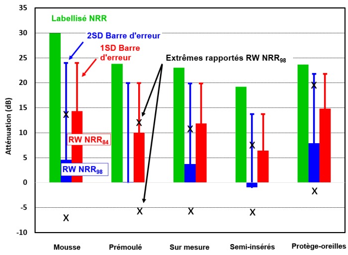 Bien qu’il y ait une variation de 11 dB entre les catégories pour les valeurs de NRRs (barres vertes) cataloguées , les bouchons en mousse atteignent la valeur la plus élevée et les Bouchons semi-insérés la plus faible, la différence entre les catégories pour la performance sur le terrain mesuré par le NRR84 (barres rouges) est réduite à seulement 8 dB; en excluant les valeurs obtenue pour les Bouchons semi-insérés, la différence diminue à 5 dB. Compte tenu de la variabilité entre les études individuelles sur le terrain, indiquée par les flèches d’erreur 1 SD, les différences ne sont probablement pas statistiquement significatives.