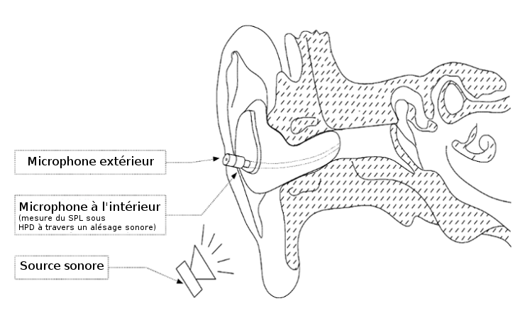 Figure 21 : Mesure physique de type microphonique « Field-MIRE », sur un bouchon d’oreille instrumenté (mesure physique en utilisant PIB de substitution), incluant la mesure des niveaux de pression acoustique à l’extérieur et sous le  PIB en présence d’une source sonore (haut-parleur représenté ici ou casque d’écoute non représentée ici).