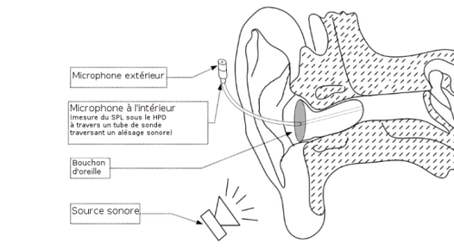 Figure 20 : Mesure physique, de type microphonique « Field-MIRE », sur un bouchon d’oreille personnalisé, incluant la mesure des niveaux de pression acoustique à l’extérieur et sous le  PIB en présence d’une source sonore (haut-parleur représenté ici ou casque d’écoute non représentée ici).
