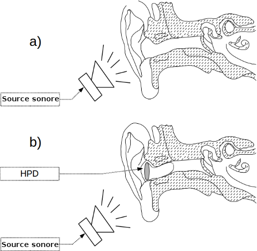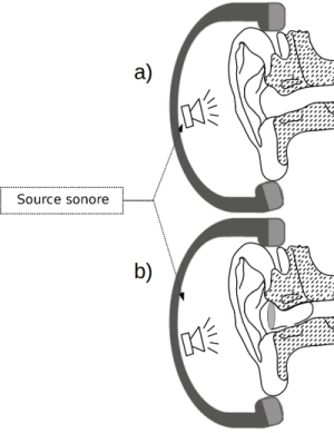 Figure 22 : Mesure psychophysique à l’aide d’un bouchon d’oreille standard par la méthode des seuils (REAT) sous un casque d’écoute: (a) Mesure de seuil auditif oreille ouverte; b) Mesure de seuil de l’oreille occluse.