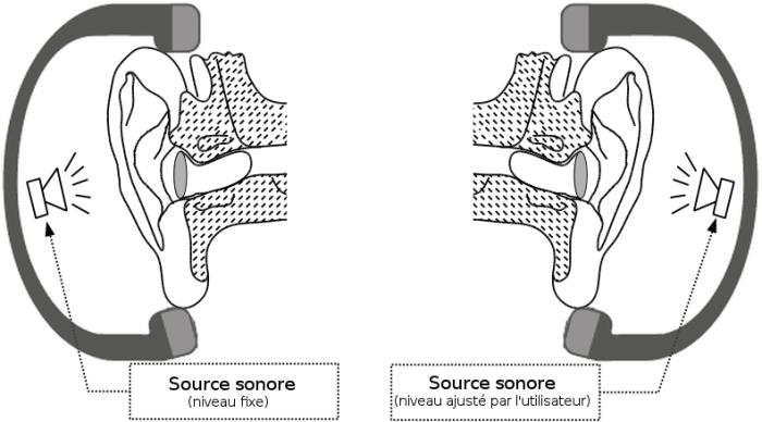 Figure 23 : Mesure psychophysique à l’aide d’un bouchon d’oreille standard par balance de sonie  : égalisation subjective du volume entre les deux oreilles sous un casque d’écoute, lors d’une séquence de tests avec d’abord les oreilles ouvertes, puis un bouchon d’oreille dans l’une des oreilles, et enfin les deux bouchons d’oreille dans les deux oreilles.