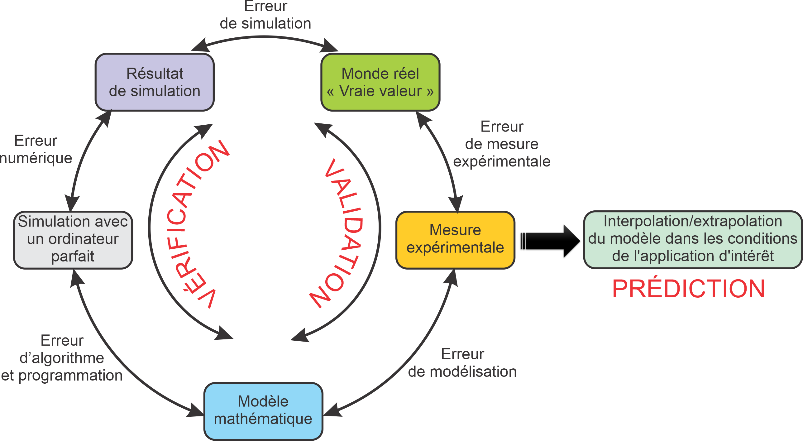 La validation est l’évaluation de l’exactitude du modèle mathématique par rapport aux observations dans le monde réel de la « vraie valeur » qu’on cherche à prédire et qui se présentent sous la forme de mesures expérimentales (c’est-à-dire de données). Notons que la « vraie valeur » n’est jamais connue et donc les données expérimentales s’accompagnent d’incertitudes aléatoires et systémiques. L’exactitude du modèle peut être par exemple évaluée grâce à un opérateur de validation métrique qui mesure la concordance entre les résultats de simulation et les observations expérimentales. La validation est très souvent confondue avec la vérification, qui elle, consiste à évaluer la précision numérique d’une simulation par rapport à la solution exacte du modèle mathématique. Il est important d’utiliser les bons termes pour éviter les incompréhensions. La vérification et la validation fournissent un moyen d’évaluer la crédibilité et l’exactitude des modèles mathématiques et de leurs simulations ultérieures. En pratique, l’étape de vérification doit être faite avant celle de validation auquel cas les résultats du modèle mathématique correspondent à ceux du modèle informatique. La différence entre la valeur de l’indicateur que l’on cherche à prédire, fournie par le modèle mathématique et sa « vraie valeur » est appelée le biais ou erreur de forme du modèle. Le biais inclut l’effet de toutes les hypothèses et approximations du modèle mathématique mais dépend également des mesures expérimentales accompagnées de leurs incertitudes, que ce soit à travers celles associées à la quantité qu’on cherche à simuler mais également celles associées aux paramètres d’entrée du modèle (géométrie, propriété des matériaux, conditions aux limites et initiales). Si l’étape de vérification a été faite, le biais peut s’exprimer en termes de différence entre la réalité et la simulation. La Figure 1 illustre ces concepts.
