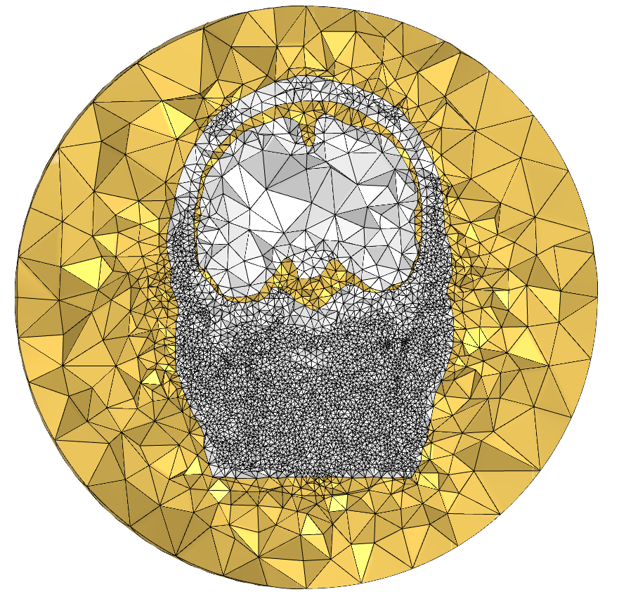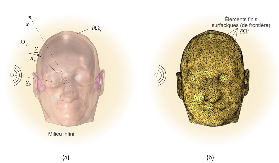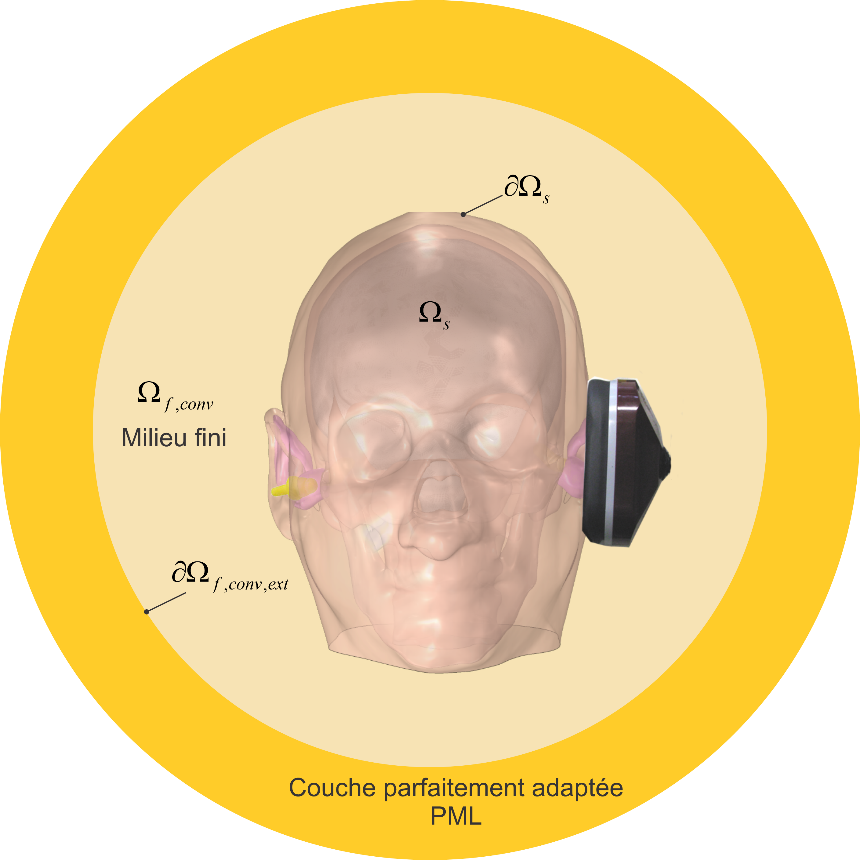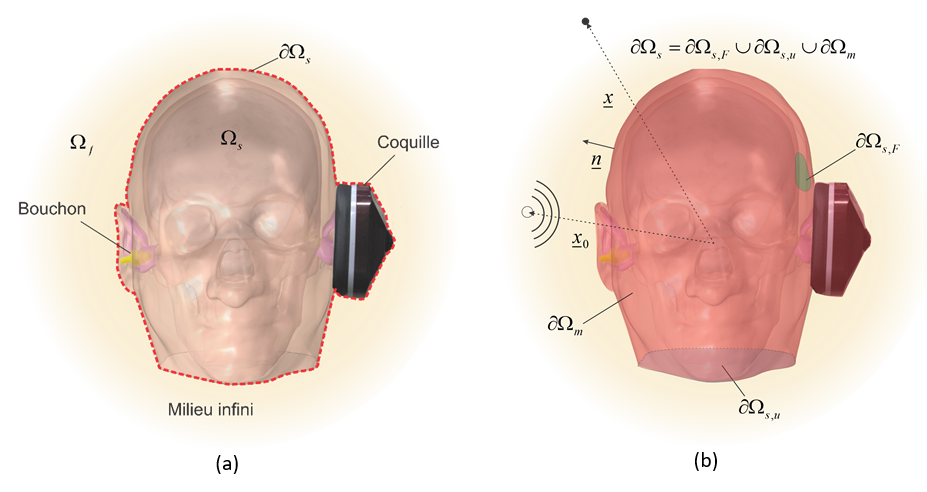 Les ondes se propageant à la fois dans un fluide (l’air ou le fluide cochléaire) et dans des structures solides (tissus de la tête, protecteur auditif) voire poroélastiques (inserts de mousses dans les coquilles des serre-tête), on voit donc qu’on a un problème vibroacoustique poro-élasto-acoustique complexe à résoudre. Plus spécifiquement, dans ce chapitre, on s’intéresse au calcul de la pression acoustique à l’extérieur et à l’intérieur du canal auditif du système « tête seule » ou « tête avec protecteur ». La connaissance de la pression acoustique dans le canal ouvert et occlus pour les deux types d’excitation susmentionnés permet en outre d’en déduire la perte par insertion (IL) du protecteur ainsi que son effet d’occlusion (EO). La détermination du champ de pression acoustique à l’extérieur permet de calculer d’autres indicateurs comme l’affaiblissement sonore (NR). A noter qu’ici on se concentre sur l’oreille externe puisque c’est la seule partie anatomique d’un sujet vivant qui est accessible à des capteurs pour évaluer la pression acoustique à condition bien sûr de respecter les règles d’usage en éthique. Par contre, on tient compte de l’effet de l’oreille moyenne et interne sur la pression acoustique dans le canal auditif  .
