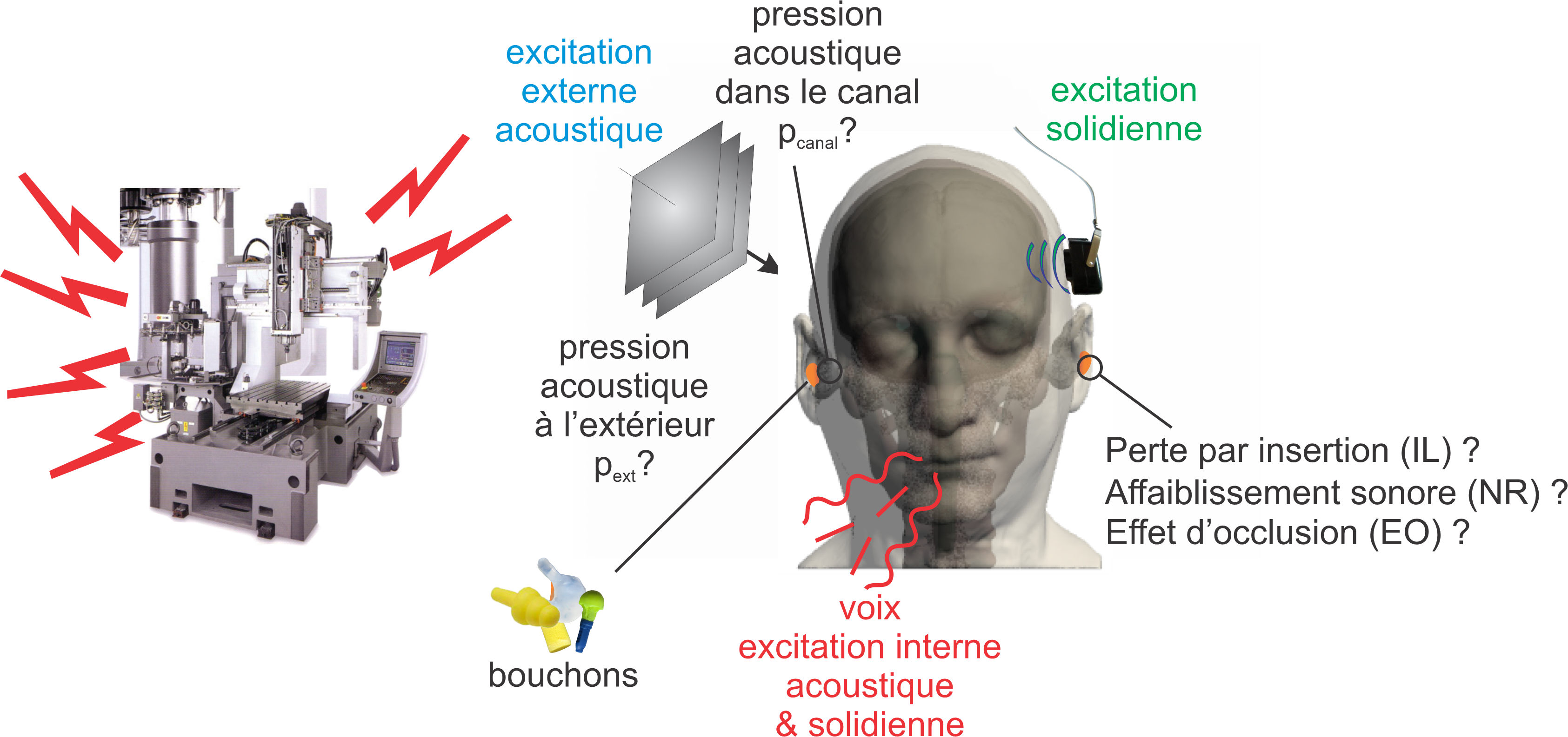Dans le cadre de la protection auditive, un modèle du comportement acoustique de l’oreille occluse par un protecteur auditif peut, par exemple, (i) aider à comprendre finement les mécanismes de transmission sonore à travers le protecteur auditif (ii) être de ce fait une alternative efficace à l’empirisme et aux méthodes d’essais/erreurs utilisés pour concevoir des protecteurs auditifs adaptés à l’environnement sonore (iii) aider à estimer les variables physiques corrélées a priori au confort du protecteur (iv) aider à élaborer des méthodes de mesures pour caractériser les performances des protecteurs auditifs ou l’exposition sonore du travailleur (v) améliorer la conception des ATF pour la mesure d’atténuation sonore des protecteurs auditifs (vi) concevoir des ATF réalistes permettant d’évaluer les variables objectives associées au confort des protecteurs auditifs.