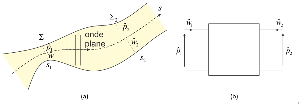 Si l’ on s’intéresse à la propagation d’ondes acoustiques harmoniques dans un guide d’onde fluide entre deux abscisses [latex]s_1[/latex] et  [latex]s_2\,\, (s_2>s_1)[/latex] de l’axe de ce guide (voir Figure 3a), on peut relier la pression acoustique [latex]{\hat p}_1[/latex] et le débit acoustique [latex]{\hat w}_1[/latex] qui passe à travers la section droite en [latex]s_1[/latex] à la pression [latex]{\hat p}_2[/latex] et le débit acoustique [latex]{\hat w}_2[/latex] en [latex]s_2[/latex] par un quadripôle[7]  (voir Figure 3b) :