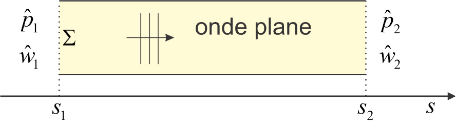 La matrice qui relie le vecteur d’entrée à celui de sortie est appelée matrice de transfert et ses composantes caractérisent entièrement l’élément. Ces termes dépendent des dimensions et propriétés physiques de chaque élément. Ils peuvent être mesurés (ex (Hiselius, 2004, 2005, 2006 ; Hudde, 1983) ou calculés (Allard et Atalla, 2009). Par exemple dans le cas d’une portion de guide d’onde acoustique (non dissipatif) droit, à section constante de surface [latex]\Sigma[/latex] comprise entre les deux abscisses  [latex]s_1[/latex] et [latex]s_2[/latex] (voir Figure 4), on a :