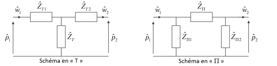 Un quadripôle peut également être représenté par un circuit électrique équivalent composés de dipôles[8] (ou impédances) avec par exemple un schéma de type « T » ou « [latex]\Pi[/latex]» (voir Figure 5). Plusieurs analogies acousto-mécano-électriques existent. L’analogie directe (ou analogie impédance) consiste à faire correspondre à la vitesse d’une masse acoustique/mécanique le courant électrique et associer une impédance électrique à une impédance acoustique/mécanique. Une masse acoustique/mécanique est alors associée à une inductance alors que la compressibilité acoustique/raideur mécanique est représentée par une capacitance. L’analogie inverse (ou analogie admittance) consiste à faire correspondre la tension électrique à la vitesse d’une masse acoustique/mécanique et associer une admittance électrique à une impédance acoustique/mécanique. Une masse acoustique/mécanique est alors associée à une capacitance alors que la compressibilité acoustique/raideur mécanique est représentée par une inductance. Dans les deux types d’analogie, la résistance acoustique/mécanique qui traduit un effet dissipatif dû aux frottements de l’élément est associée à une résistance électrique.