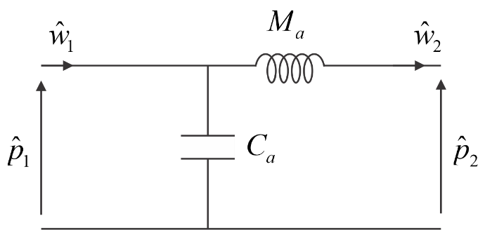 [latex]{\hat p_1} - {\hat p_2} \approx i\omega \frac{{{\rho _0}L}}{\Sigma }\hat w = i\omega {M_a}\hat w[/latex] (1.8)