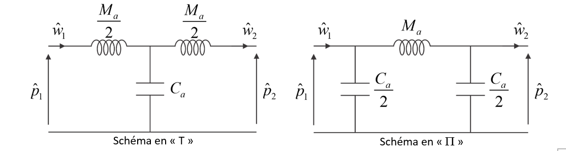 où [latex]L = s_2-s_1[/latex], [latex]V=\Sigma L[/latex], [latex]\hat w = \hat w_1 = \hat w_2[/latex] et [latex]\hat p= \hat p_1 = \hat p_2[/latex]. L’équation (1.8) traduit l’effet inertiel du fluide caractérisé par son débit [latex]\hat w[/latex]  et sa masse acoustique [latex]M_a[/latex][kgm-4][10] et associé à une chute de pression. L’équation (1.9) traduit l’effet de compressibilité du fluide contenu dans le volume [latex]V[/latex] et caractérisé par sa pression acoustique [latex]\hat p[/latex] et sa souplesse acoustique[11] [latex]C_a[/latex] [m5N-1]  et associé à la chute de débit.  On peut associer un circuit électrique équivalent (Figure 7).