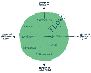 Le terme « flow » nommé également « état psychologique optimal » est souvent utilisé pour décrire un état mental optimal dans lequel une personne est complètement absorbée et engagée dans une activité. Ce concept est issu des travaux de Mihaly Csikszentmihalyi dans le champ de la psychologie positive. Ses travaux réalisés de 1975 à 2000 sont axés sur l’étude du contexte d’apparition et de la structure du plaisir dans la pratique d’une activité. Pour Csikszentmihalyi (2000), le flow fait référence à un état de plaisir maximal, de concentration intense et un sentiment de contrôle ressenti par les personnes engagées dans une activité. Cette sensation d’être immergé dans une activité ou une expérience et d’en ressortir avec un sentiment de plénitude caractérise l’état de flow. L’activité est perçue comme plaisante et motivante en elle-même (Arnaud et Mellet, 2019). Le flow est un mot qui est souvent associé aux sports de haut niveau ou aux expériences de loisirs qui soulèvent des passions. Or, le jeu peut également susciter cet état de flow. En effet, le jeu permet de capter l’attention des personnes pour de longues périodes, tout en procurant un sentiment d’accomplissement et de bien-être contribuant à un état de flow propice à l’apprentissage.