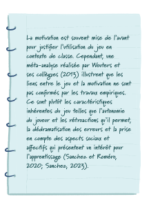 Lorsqu’il s’inscrit dans un contexte de classe qui vise à soutenir le travail d’équipe et la collaboration, le jeu peut susciter la motivation de la personne étudiante. En effet, la motivation est favorisée « par le niveau de satisfaction, d’excitation, d’enthousiasme ou de plaisir que l’apprenant exprime dans le jeu et les bénéfices que ces émotions apportent sur le plan de l’apprentissage » (Sauvé et al., 2007, p. 97). Cependant, comme mentionné précédemment, la motivation de la personne étudiante dépend de l’importance qu’elle accorde à l’objectif du jeu et de son intérêt face à la tâche à accomplir.