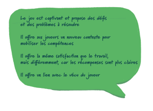 L’idée que le jeu puisse présenter un intérêt sur le plan éducatif n’est pas nouvelle (Sanchez et Roméro, 2020). L’utilisation pédagogique du jeu vise surtout à intégrer des valeurs sociales de façon amusante telles que coopérer plutôt que de s’affronter, réfléchir avant d’agir, savoir partager des ressources, etc. La valeur pédagogique du jeu reste toutefois intimement liée à la faculté d’analyse et à la subjectivité du joueur qui interprète une situation comme un jeu. En effet, pour Henriot (1969) dont les travaux sont associés au jeu, « le jeu n’est pas dans la chose mais dans l’usage qu’on en fait » (p. 24). Ainsi, en contexte de cours, il ne s’agit pas de proposer un jeu, il faut aussi que la personne étudiante le perçoive et y participe comme un jeu (Sanchez, 2023).