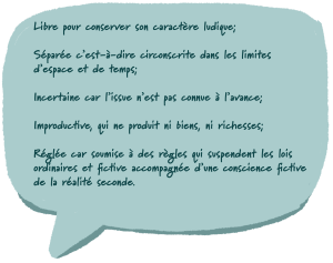 Comme il est possible de le constater, les caractéristiques d’un jeu peuvent varier selon différents auteurs et chercheurs qui s’intéressent au jeu. Cependant, les différentes perspectives mettent de l’avant des éléments communs tels que le caractère libre ou volontaire du jeu, le plaisir ou la fantaisie, et son caractère fictif.